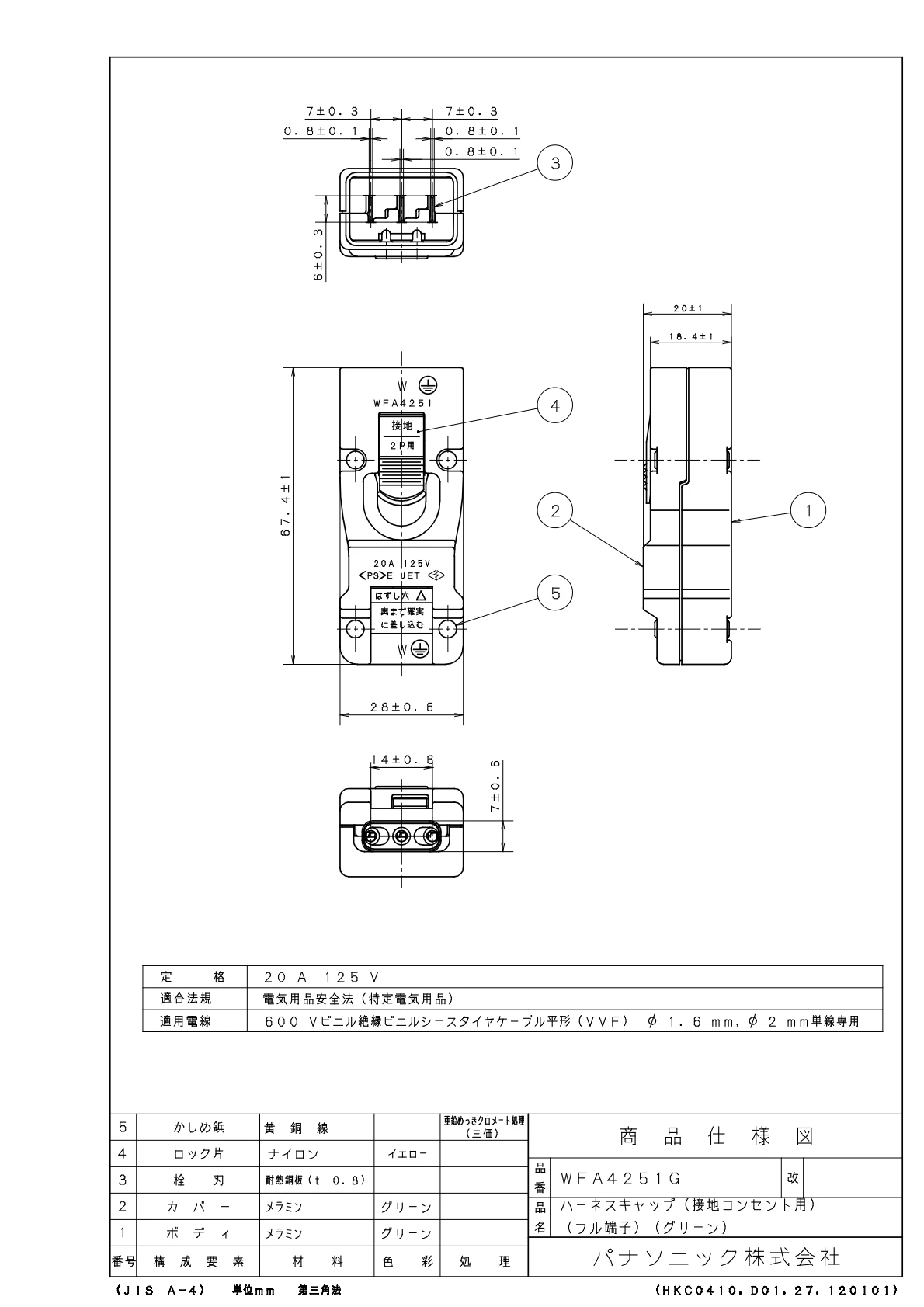 品番:WFA4251G品名:ハーネスキャップ(接地コンセント用)(フル端子)