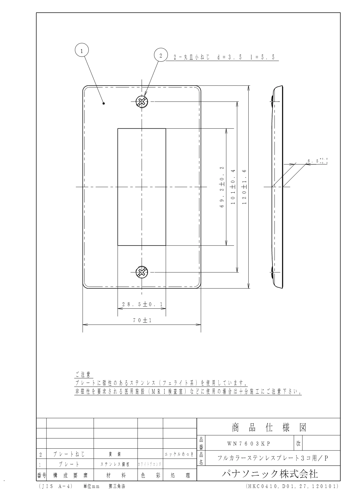 品番:WN7603KP品名:ステンレスプレート3コ用/プラスチック個装