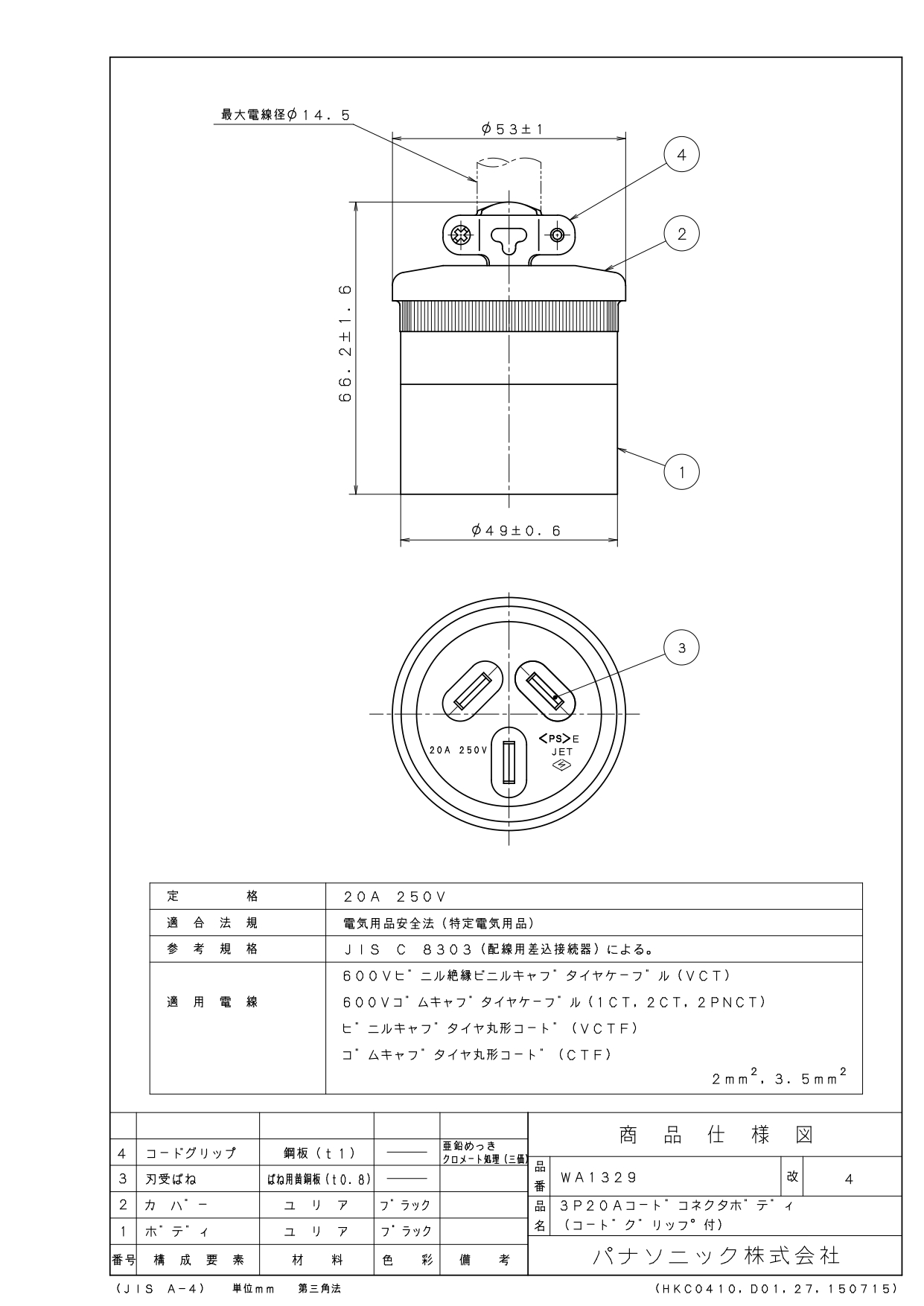 品番:WA1329品名:3P20Aコードコネクタボディ(コードグリップ付)