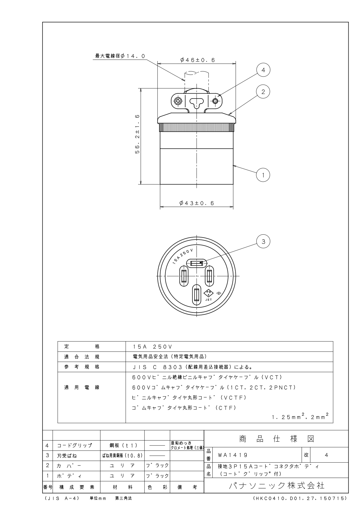 品番:WA1419品名:接地3P15Aコードコネクタボディ(コードグリップ付)