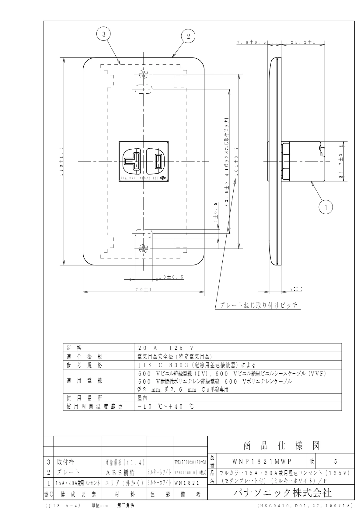 品番:WNP1821MWP品名:フルカラー15A・20A兼用埋込接地コンセント(125V)(モダンプレート付)/プラスチック個装