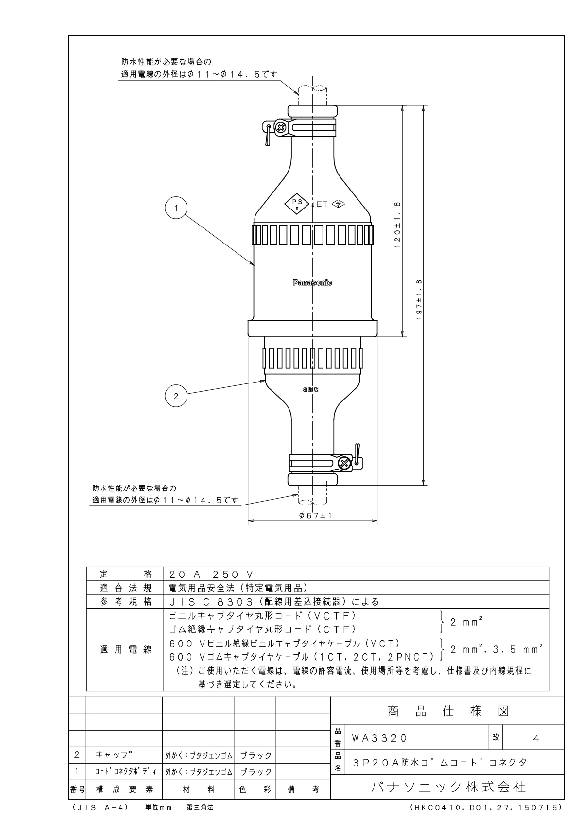 - 電設資材 > パナソニック(Panasonic) > フルカラー配線器具 > 防水ゴムコードコネクタセット品 > 3P