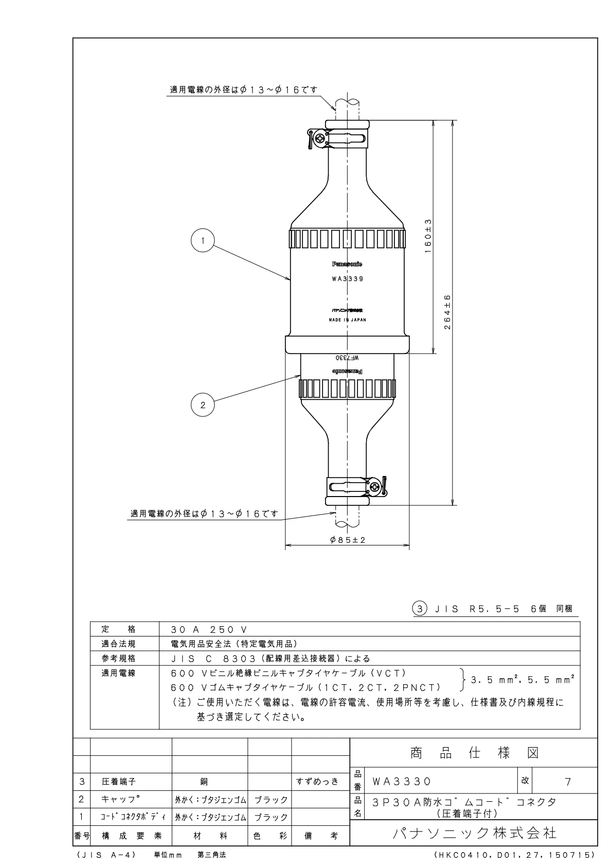 品番:WA3330品名:3P30A防水ゴムコードコネクタ(圧着端子付)