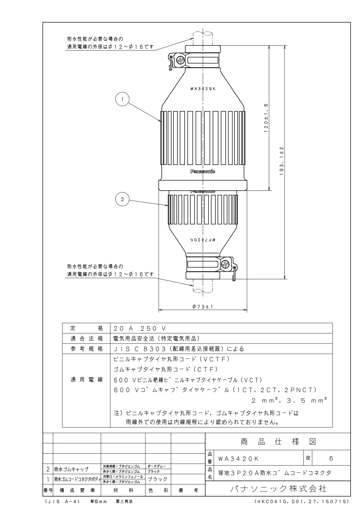 品番:WA3420K品名:接地3P20A防水ゴムコードコネクタ