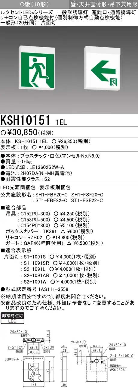 KSH10151 1EL+S1-1091S 非常口・避難口誘導灯C級(10形)片面型セット(左向パネル付) 【KSH1951B1EL+S1-1081S後継品】