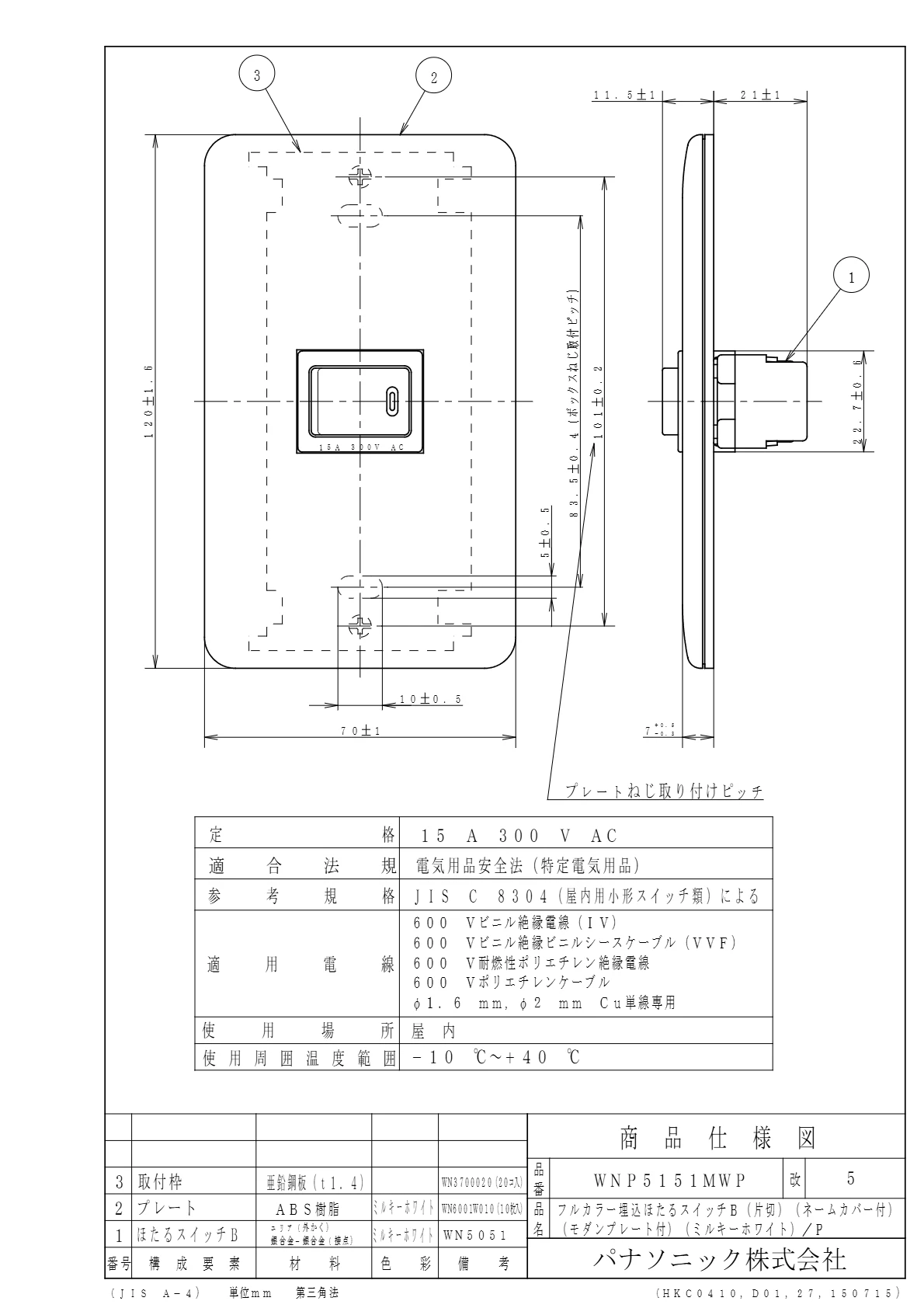 品番:WNP5151MWP品名:埋込ほたるスイッチB(片切・ネームカバー付)(モダンプレート付)(ミルキーホワイト)/プラスチック個装