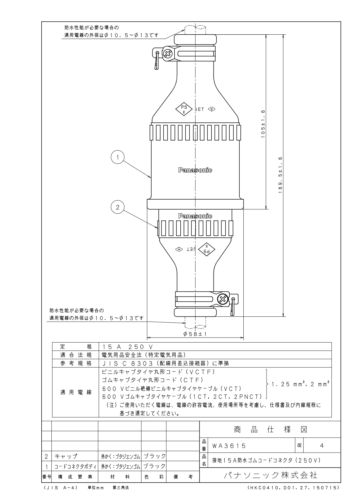 品番:WA3615品名:接地15A防水ゴムコードコネクタ(250V)