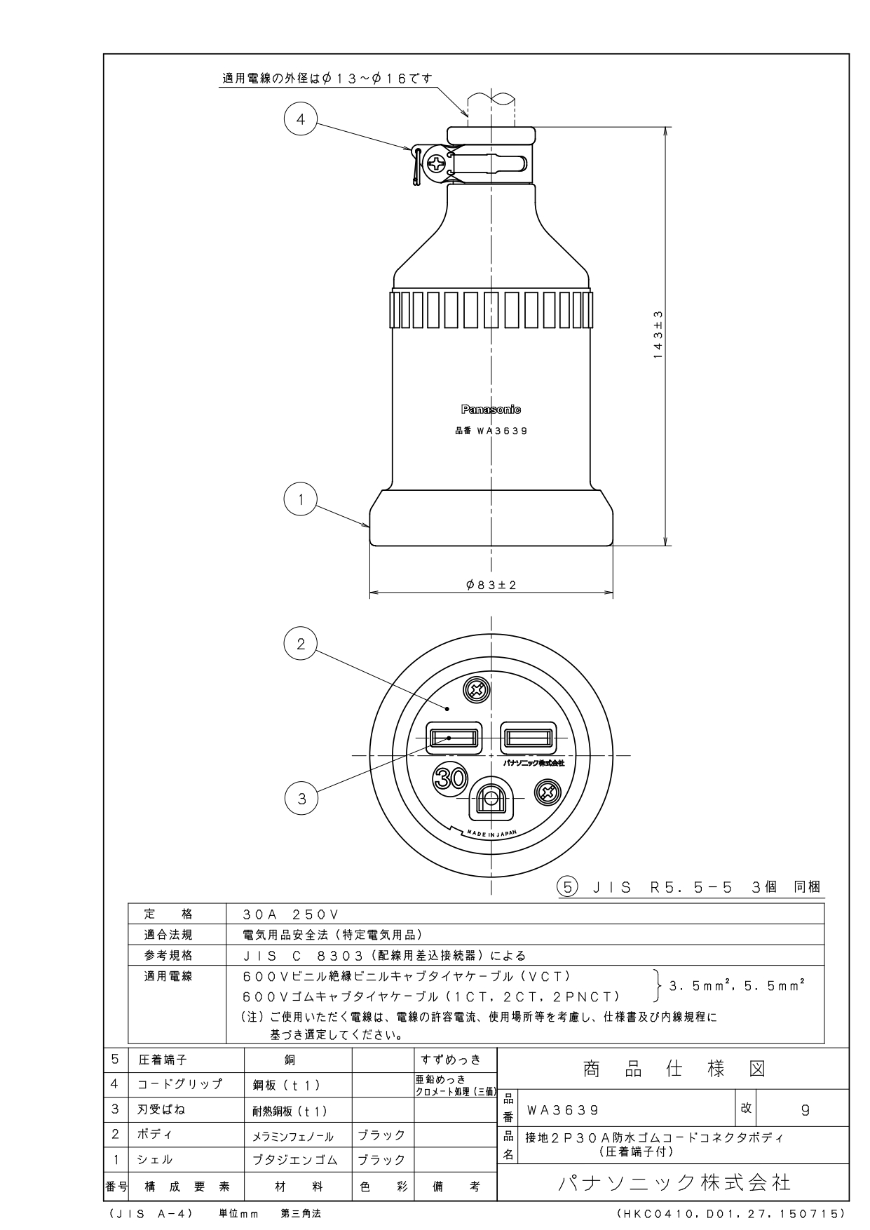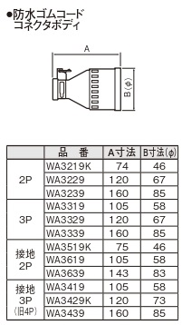 品番:WA3639品名:接地2P30A防水ゴムコードコネクタボディ(圧着端子付)