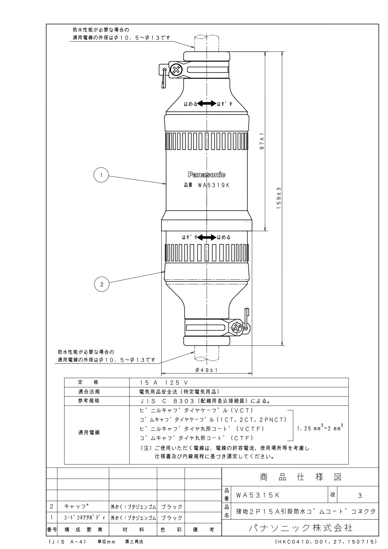 品番:WA5315K品名:接地2P15A引掛防水ゴムコードコネクタ