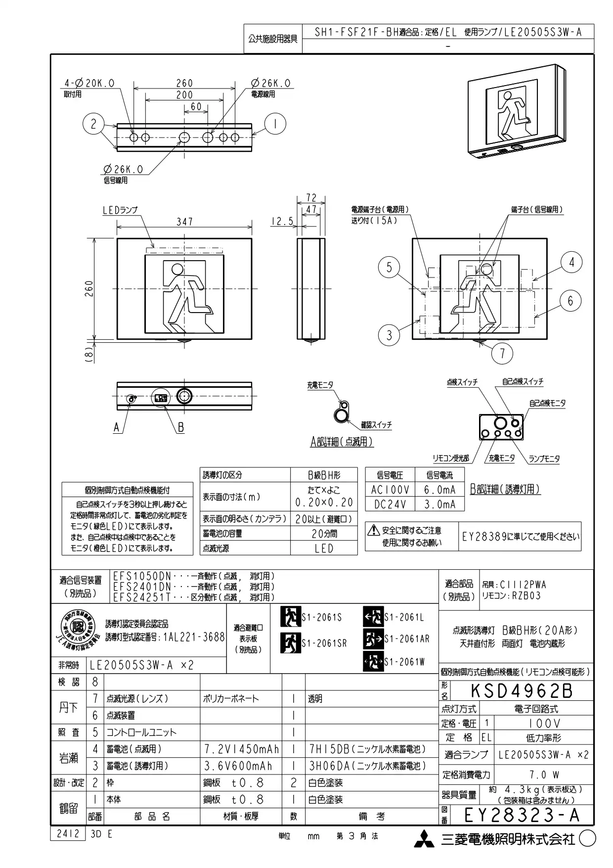 - 誘導灯(非常灯) > 点滅形 > 壁・天井直付型・吊下型 > 避難口誘導灯 > 三菱電機B級・BH形