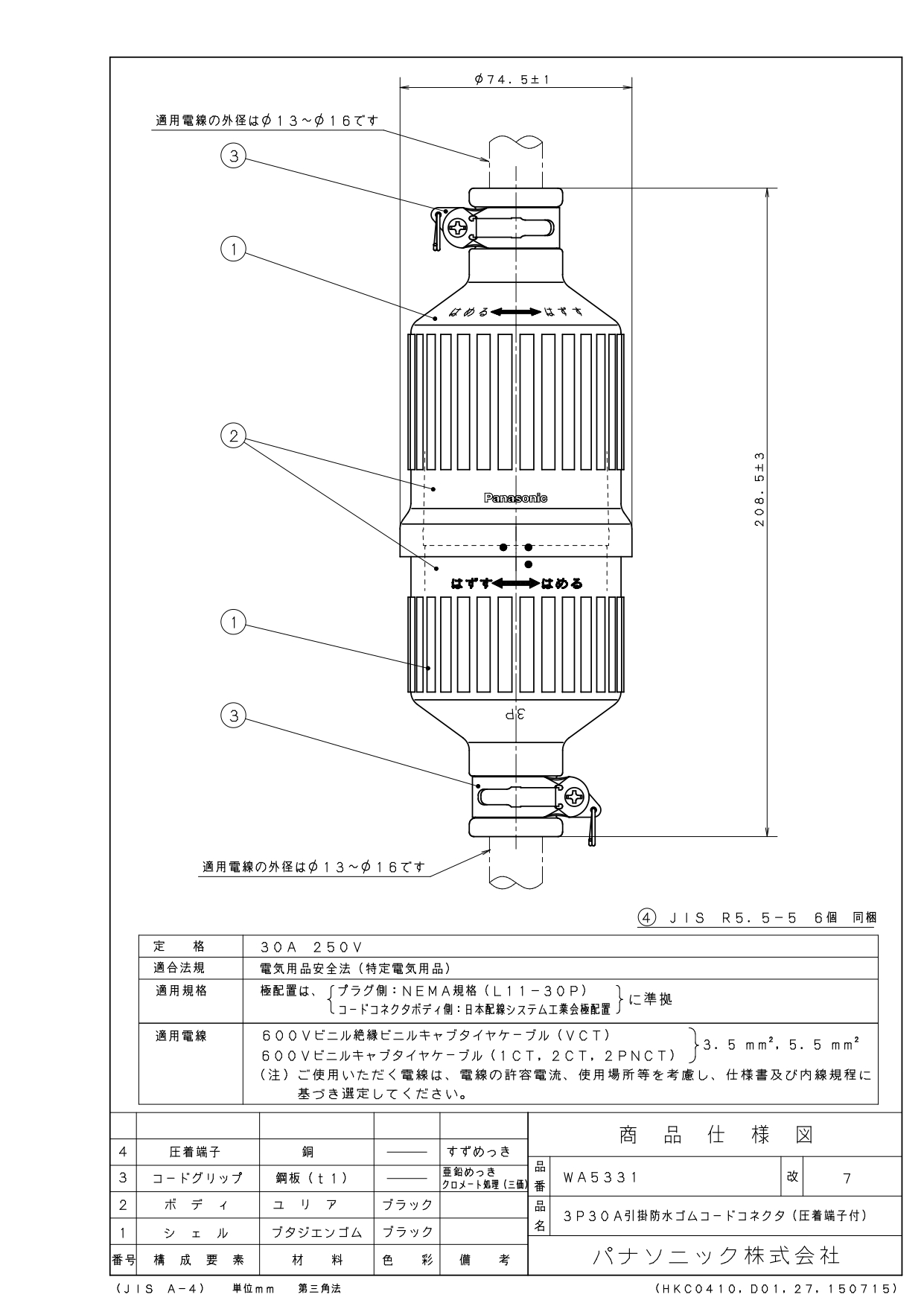 品番:WA5331品名:3P30A引掛防水ゴムコードコネクタ(圧着端子付)