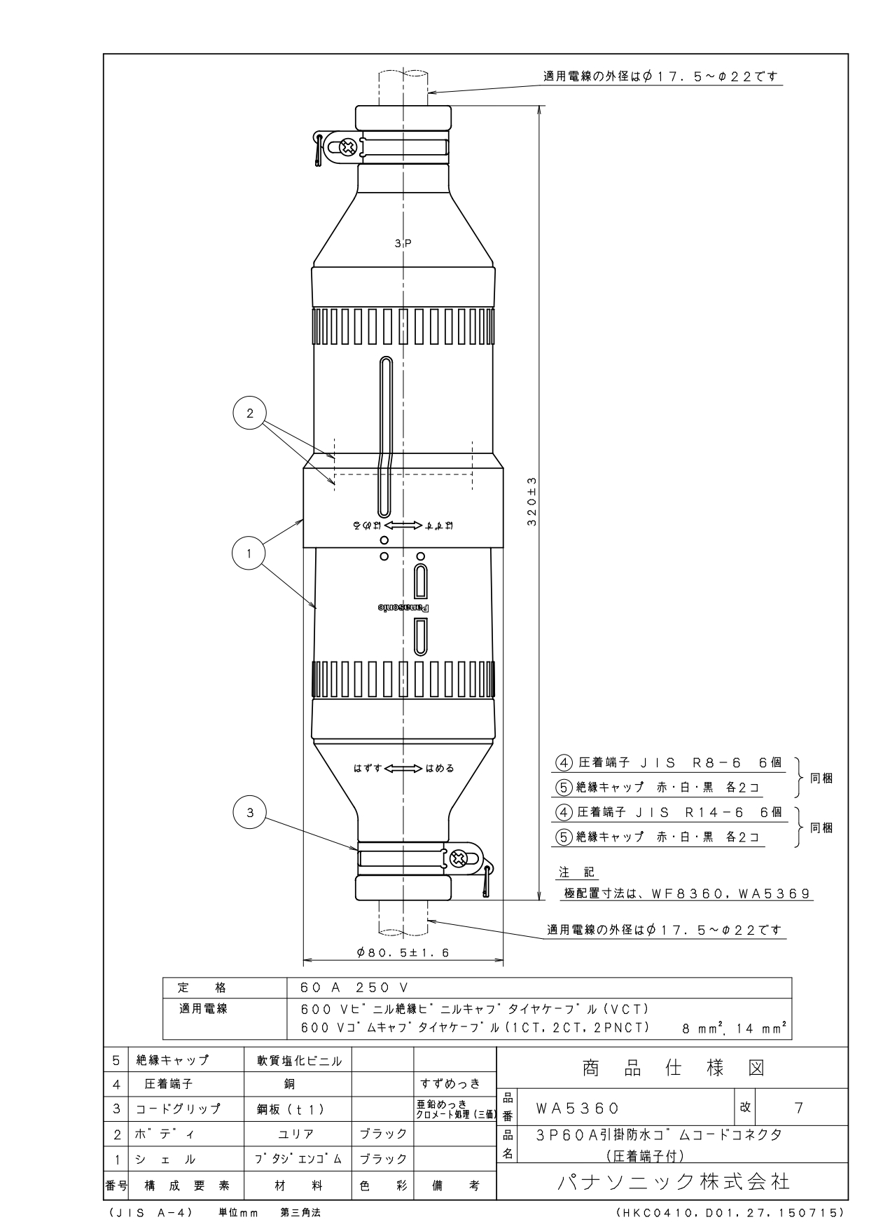 品番:WA5360品名:3P60A引掛防水ゴムコードコネクタ(圧着端子付)