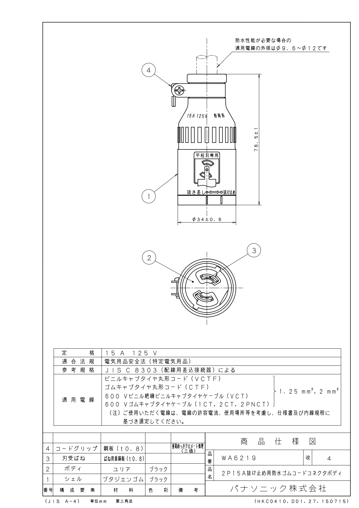 品番:WA6219品名:2P15A抜け止め防水ゴムコードコネクタボディ