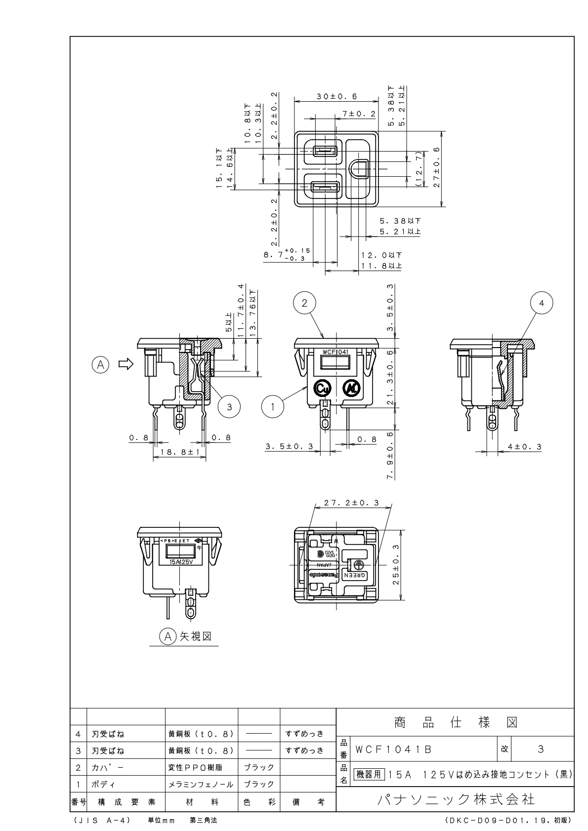 品番:WCF1041B品名:[機器用]15A125V接地はめ込みコンセント(黒)