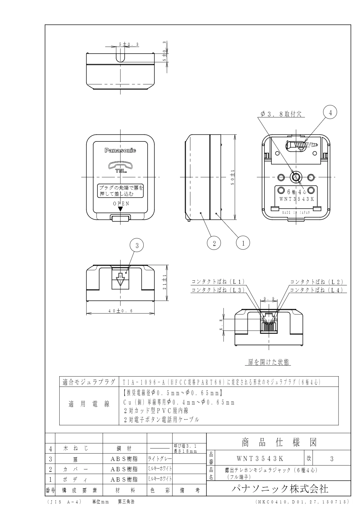 品番:WNT3543K品名:露出テレホンモジュラジャック(6極4心)(フル端子)