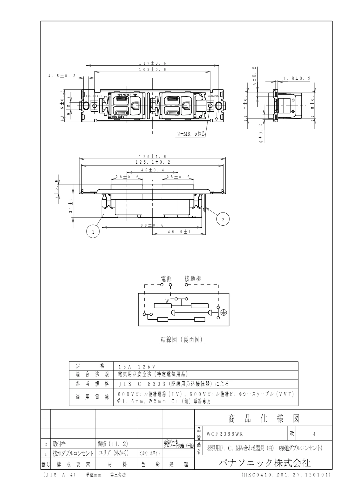 品番:WCF2066WK品名:器具用F.C組合せ器具(白)(接地ダブルコンセント)