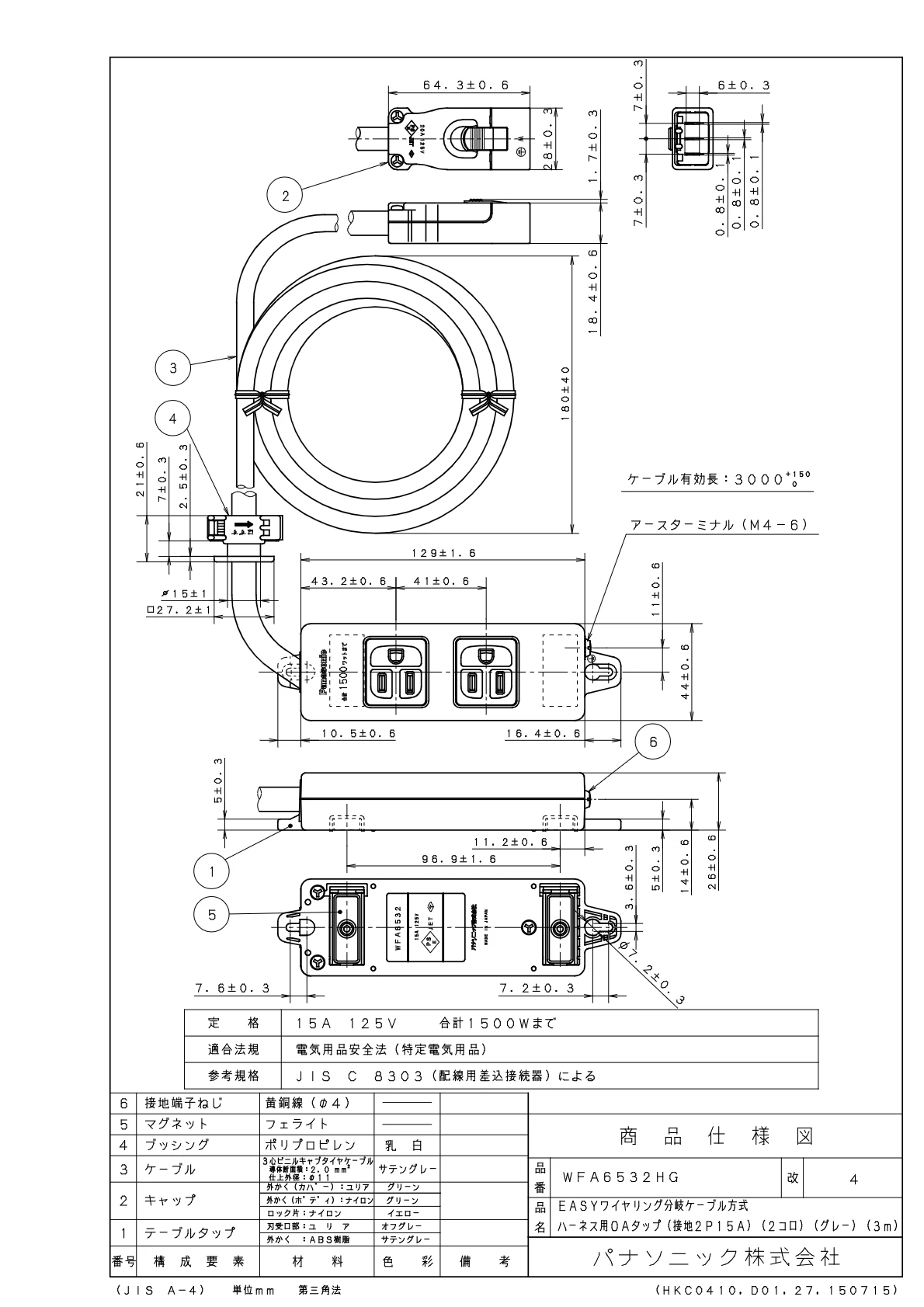 品番:WFA6532HG品名:ハーネス用OAタップ(キャブタイヤケーブル付)接地2P15A125V2コ口3Mグレー