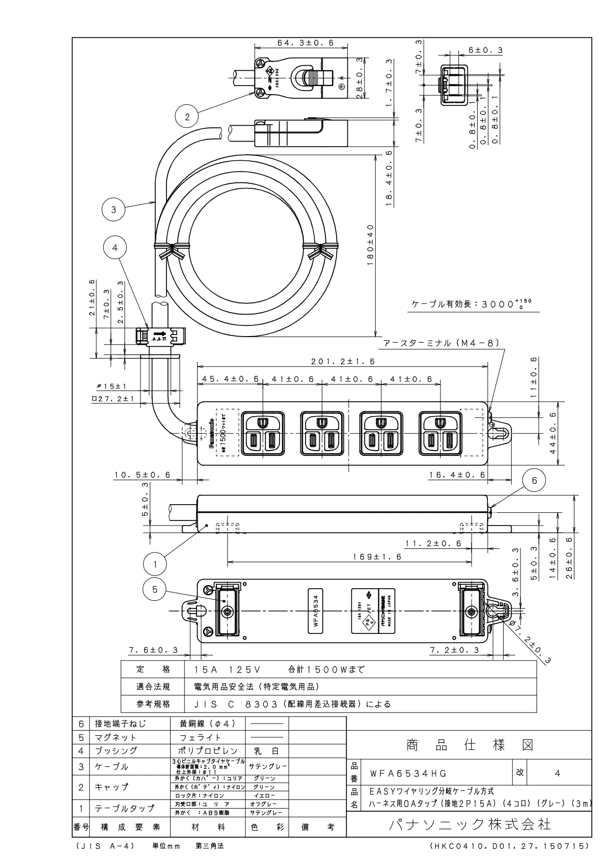 品番:WFA6534HG品名:ハーネス用OAタップ(キャブタイヤケーブル付)接地2P15A125V4コ口3Mグレー