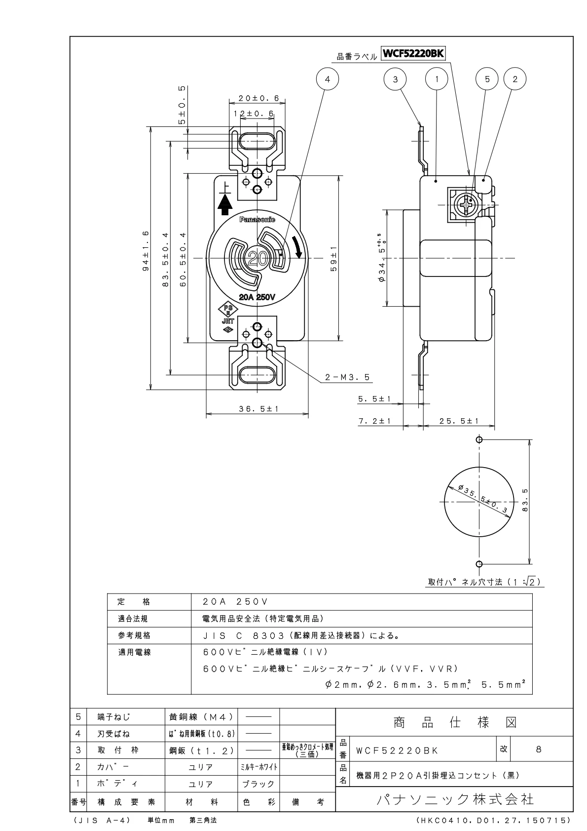 品番:WCF52220BK品名:機器用2P20A引掛埋込コンセント(黒)