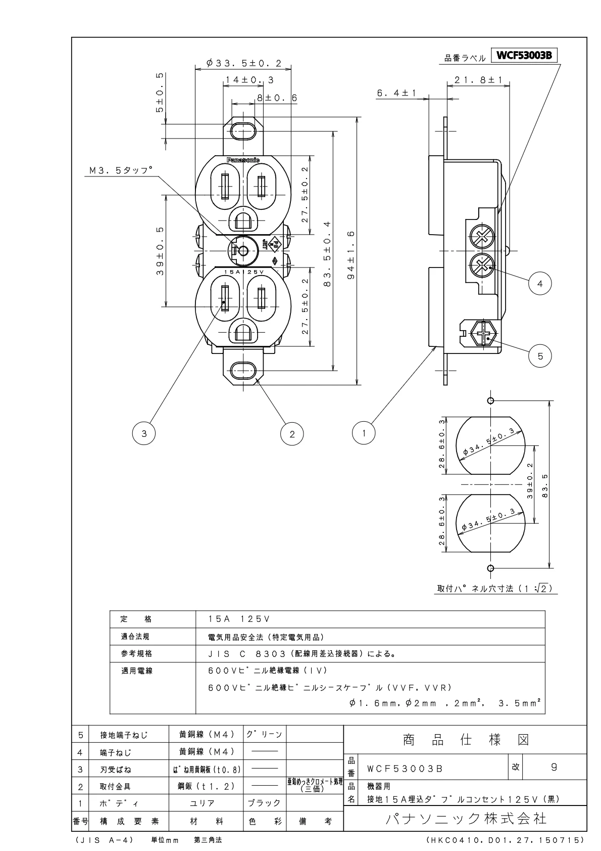 品番:WCF53003B品名:機器用接地15A埋込ダブルコンセント125V(黒)