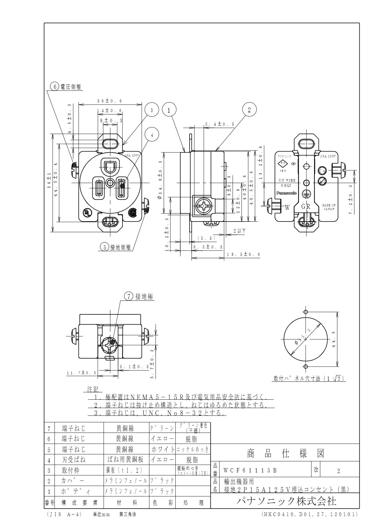 品番:WCF61115B品名:輸出機器用接地2P15A125V埋込コンセント(黒)
