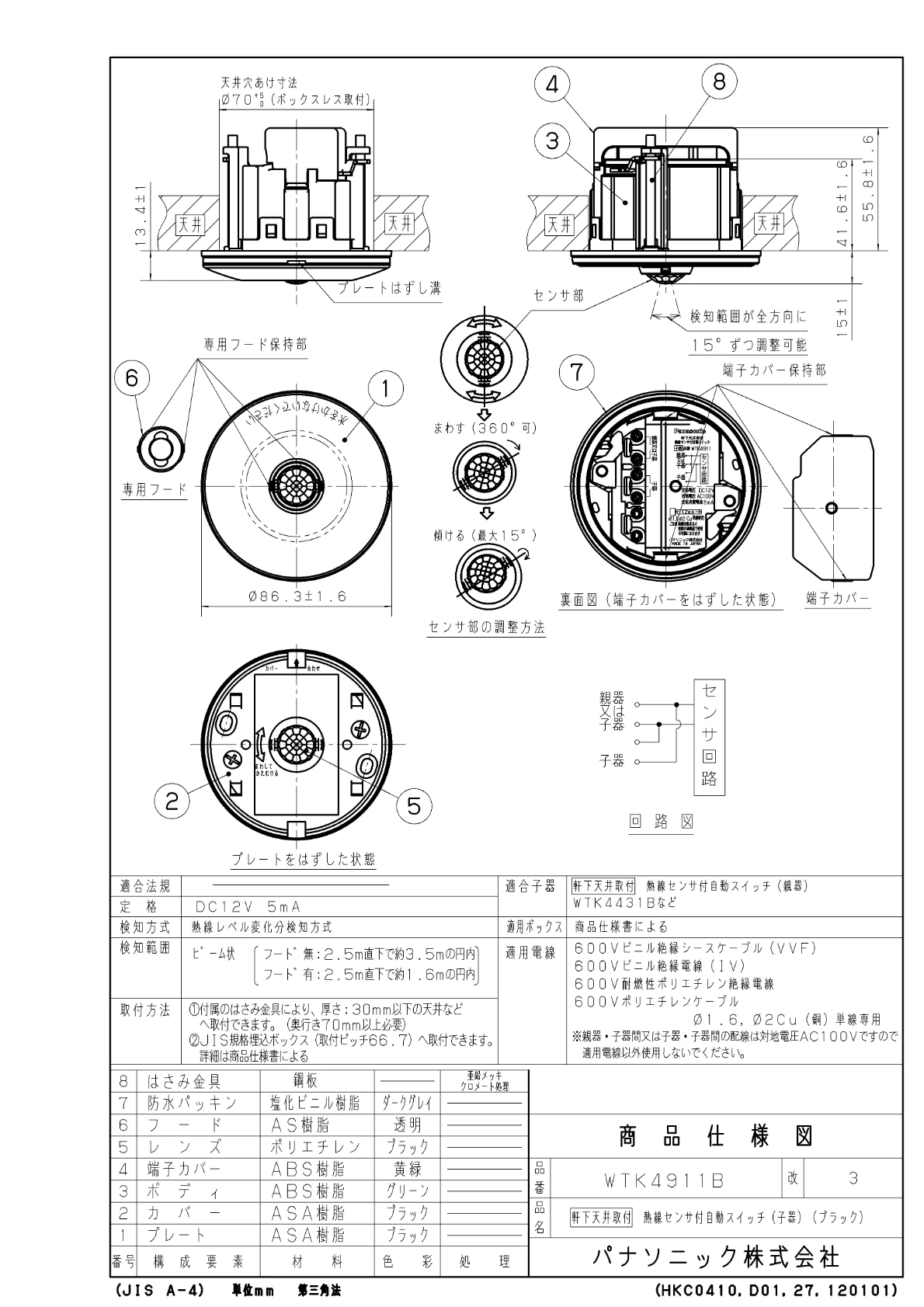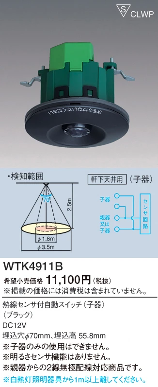 品番:WTK4911B品名:軒下天井取付熱線センサ付自動スイッチ(子器)(ブラック)