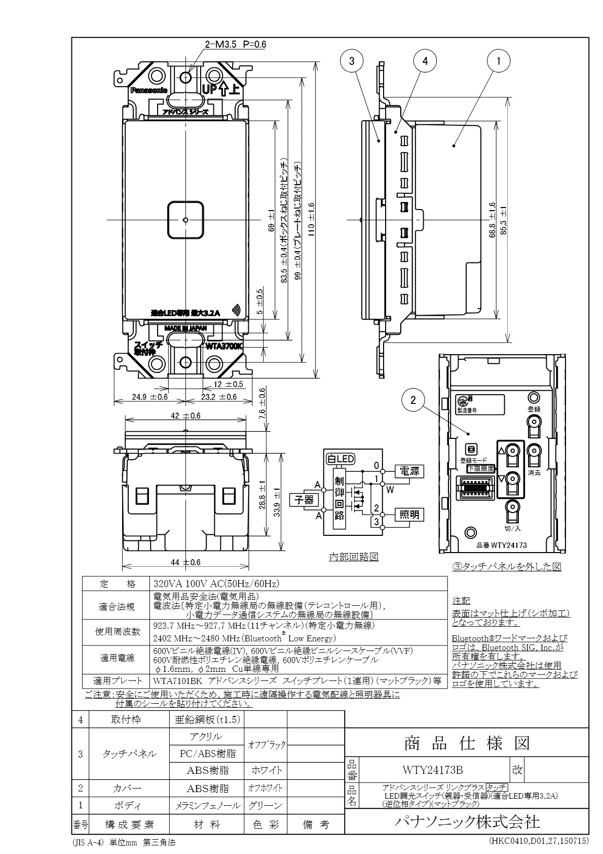 品番:WTY24173B品名:アドバンスシリーズリンクプラスタッチLED調光スイッチ(親器・受信器)(適合LED専用3.2A)(逆位相タイプ)(マットブラック)