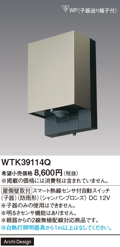 品番:WTK39114Q品名:[屋側壁取付]スマート熱線センサ付自動スイッチ(子器)(防雨形)(シャンパンブロンズ)