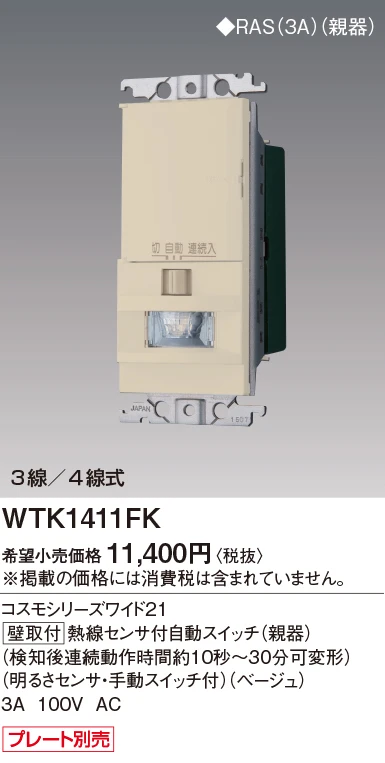 品番:WTK1411FK品名:コスモシリーズワイド21[壁取付]熱線センサ付自動スイッチ(親器)(検知後連続動作時間約10秒-30分可変形)(明るさセンサ・手動スイッチ付)(ベージュ)