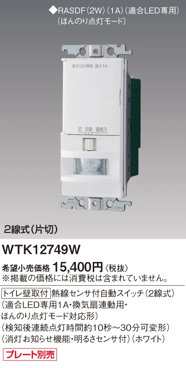 品番:WTK12749W品名:コスモシリーズワイド21トイレ壁取付熱線センサ付自動スイッチ(2線式)(適合LED専用1.2A・換気扇連動用・ほんのり点灯モード対応形)(検知後連続点灯時間約10秒~30分可変形)(消灯お知らせ機能・明るさセンサ付)(ホワイト)