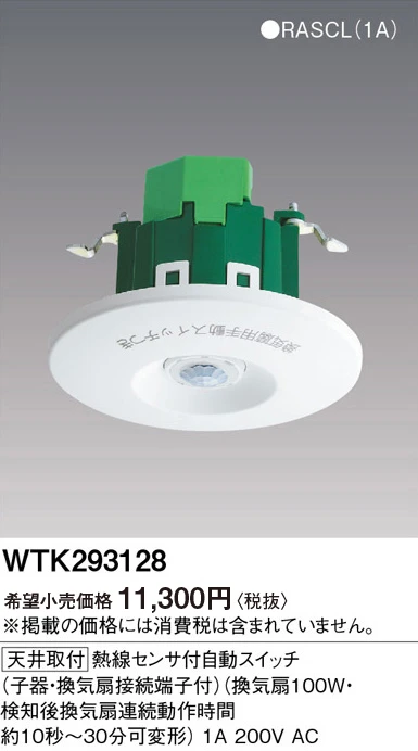 WTK293128 [天井取付]熱線センサ付自動スイッチ(子器・換気扇接続端子付)(換気扇200W・検知後換気扇連続動作時間約10秒-30分可変形)(AC200V)
