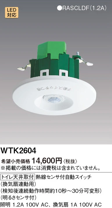 品番:WTK2604品名:[トイレ天井取付]熱線センサ付自動スイッチ(換気扇連動用)(検知後連続動作時間約10秒-30分可変形)(明るさセンサ付)