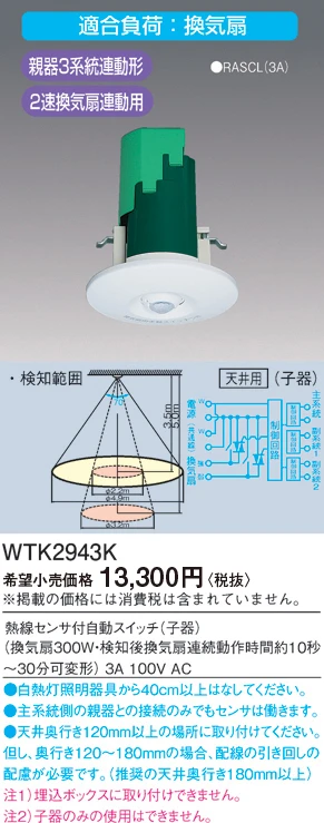 品番:WTK2943K品名:[天井取付]熱線センサ付自動スイッチ(子器・2速換気扇接続端子付・親器3系統連動形)(換気扇300W・検知後換気扇連続動作時間約10秒-30分可変形)(AC100V)