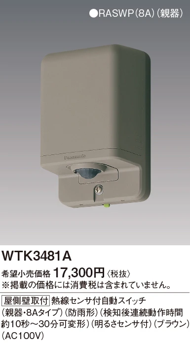 品番:WTK3481A品名:[屋側壁取付]熱線センサ付自動スイッチ(親器・8Aタイプ)(防雨形)(検知後連続動作時間約10秒-30分可変形(明るさセンサ付)(ブラウン)(AC100V)