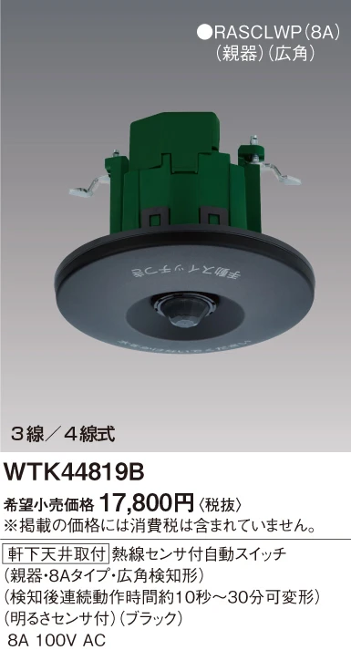 品番:WTK44819B品名:軒下天井取付熱線センサ付自動スイッチ(親器・8Aタイプ・広角検知形)(検知後連続動作時間約10秒-30分可変形)(明るさセンサ付)(AC100V)(ブラック)