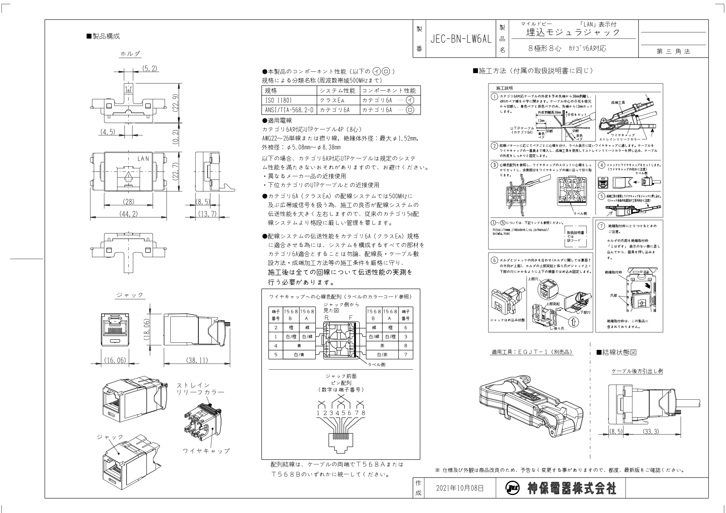 品番:JEC-BN-LW6AL-BK品名:埋込モジュラージャック 8極8心Cat6A (ブラック) LAN文字入り