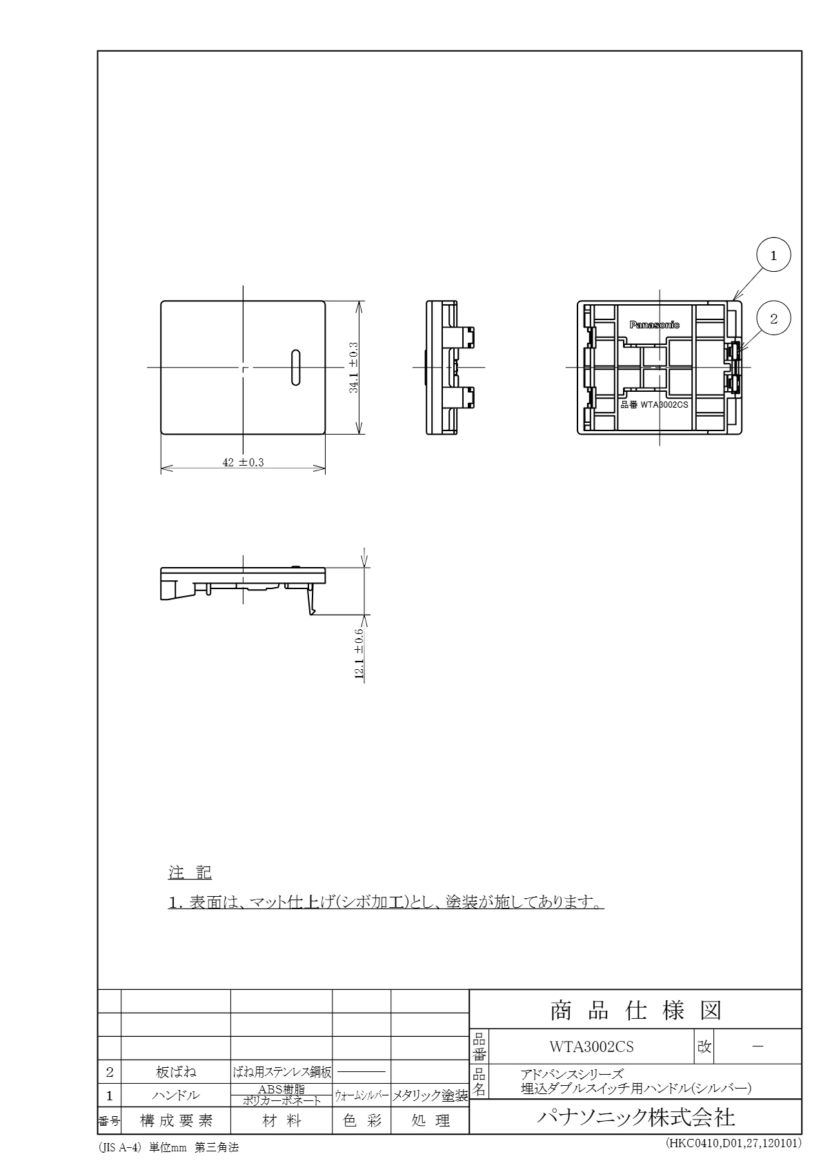 品番:WTA3002CS品名:アドバンスシリーズ 埋込ダブルスイッチ用ハンドル
