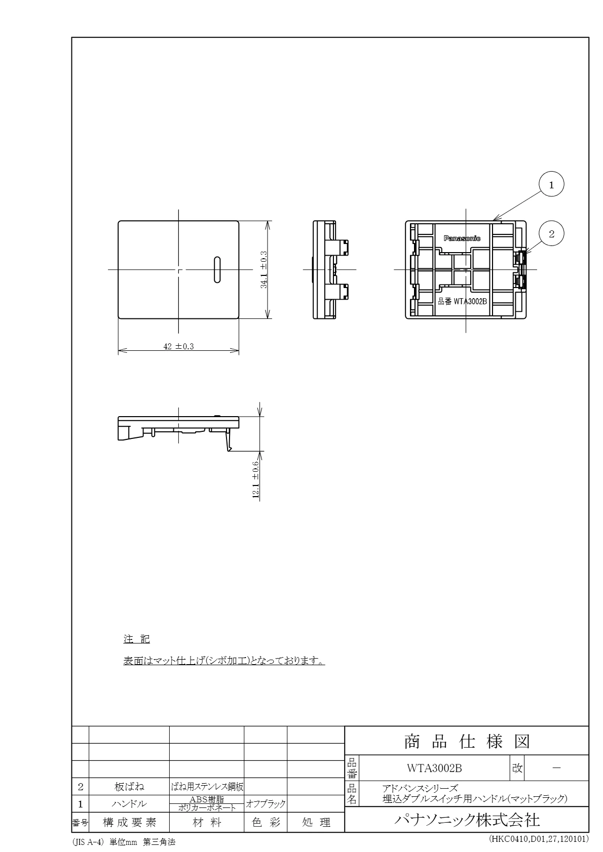 品番:WTA3002B品名:アドバンスシリーズ埋込ダブルスイッチ用ハンドル(マットブラック)