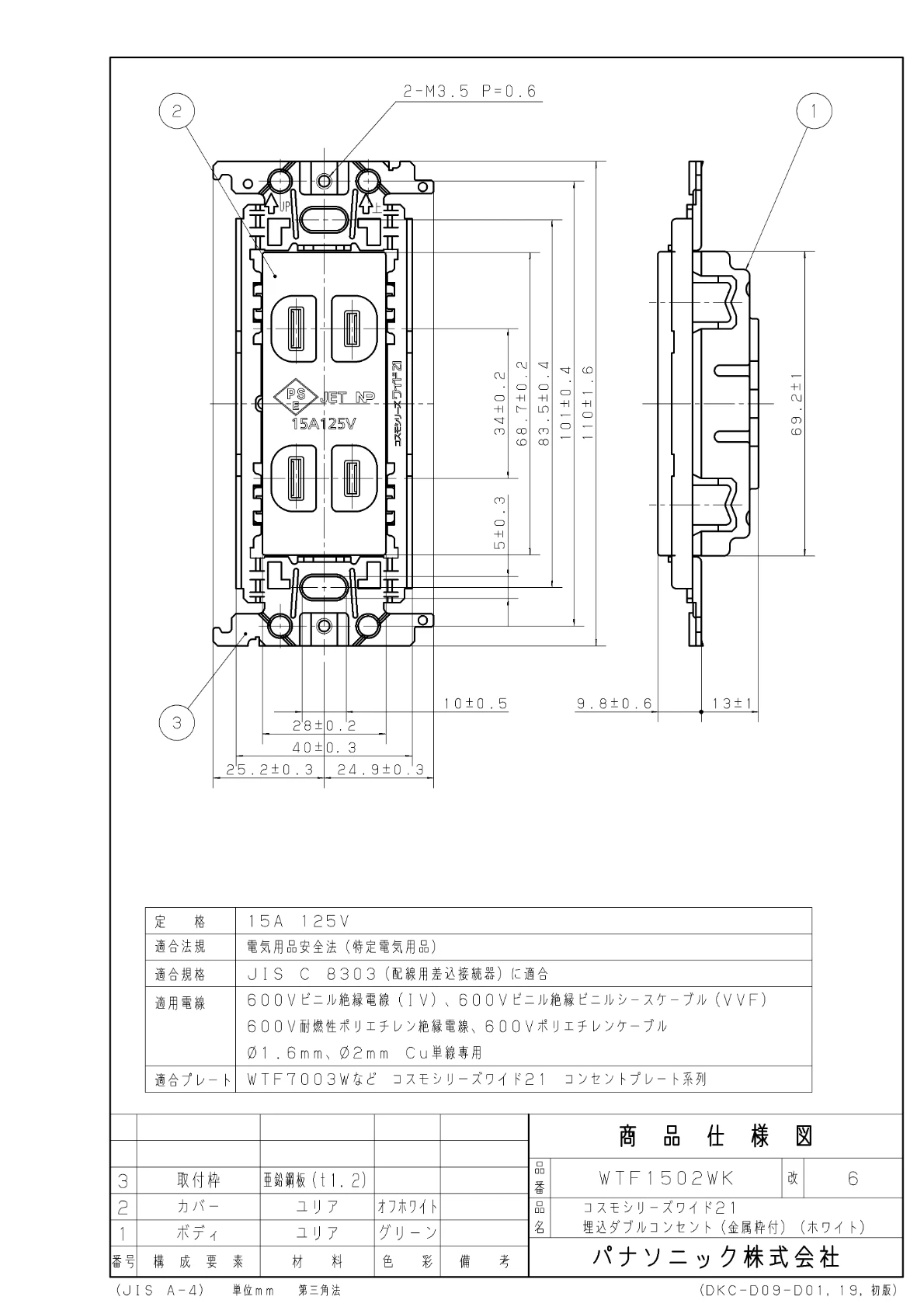 WTF1502WK 埋込ダブルコンセント(金属枠付)(ホワイト)