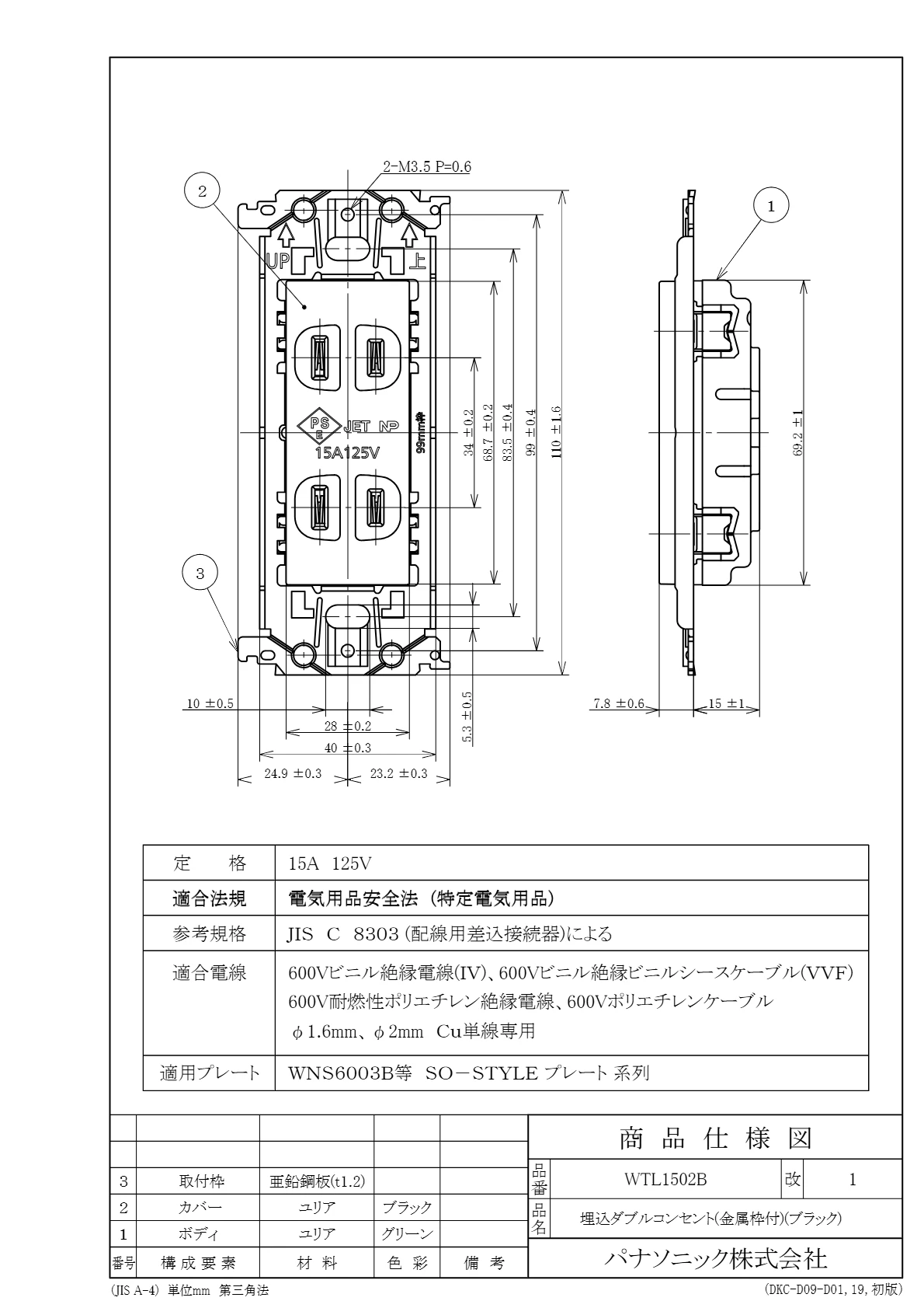 品番:WTL1502B品名:アドバンスシリーズ 埋込ダブルコンセント(金属枠付)(ブラック)