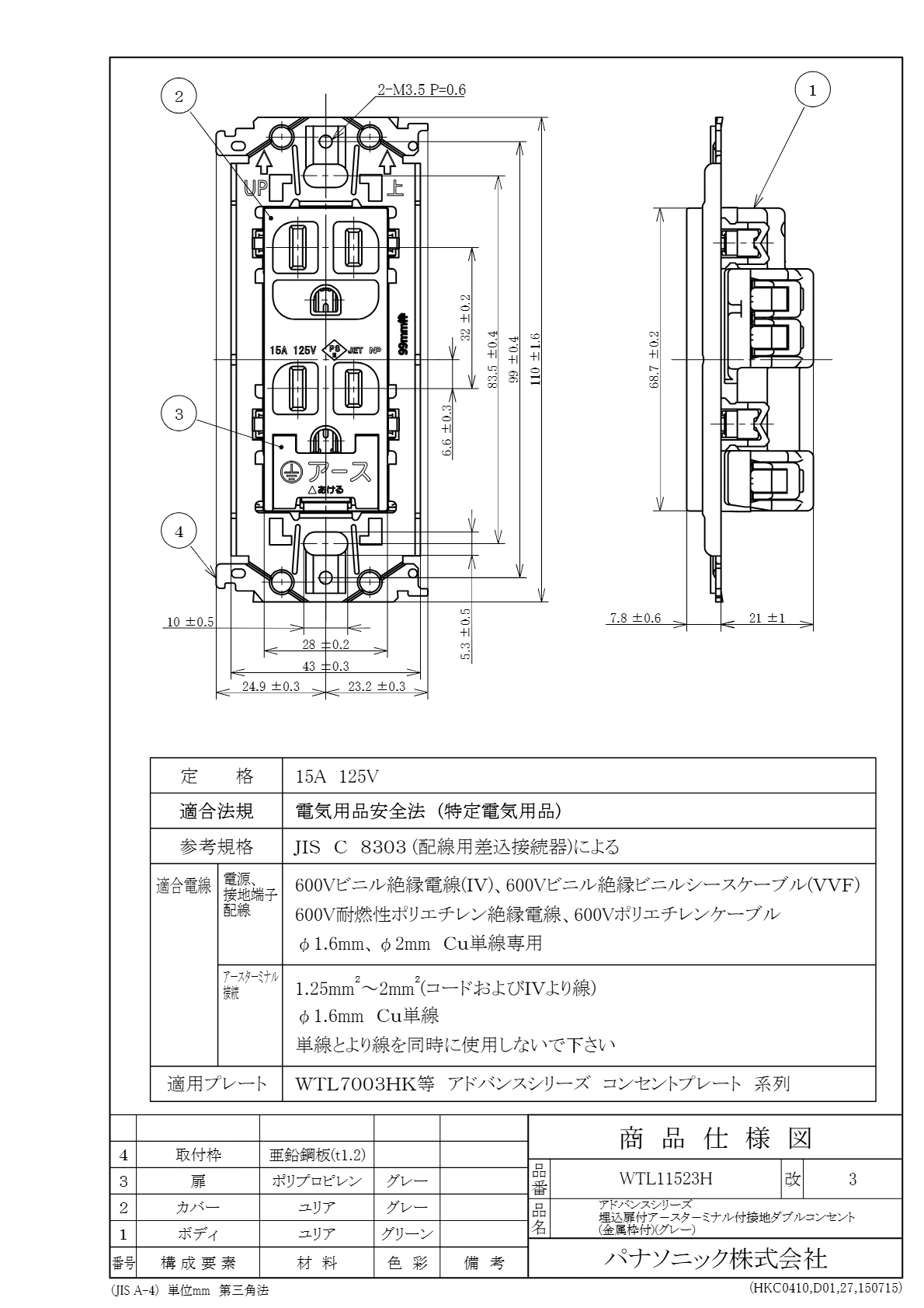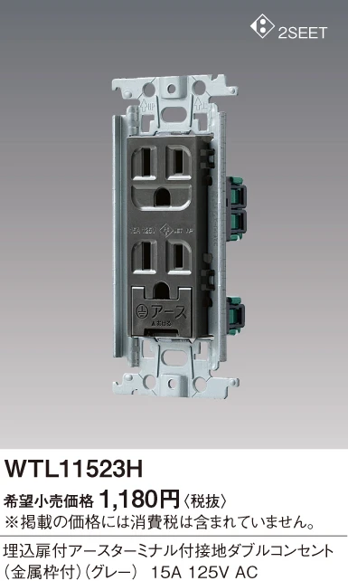 品番:WTL11523H品名:アドバンスシリーズ 埋込扉付アースターミナル付接地ダブルコンセント(金属枠付)(グレー)