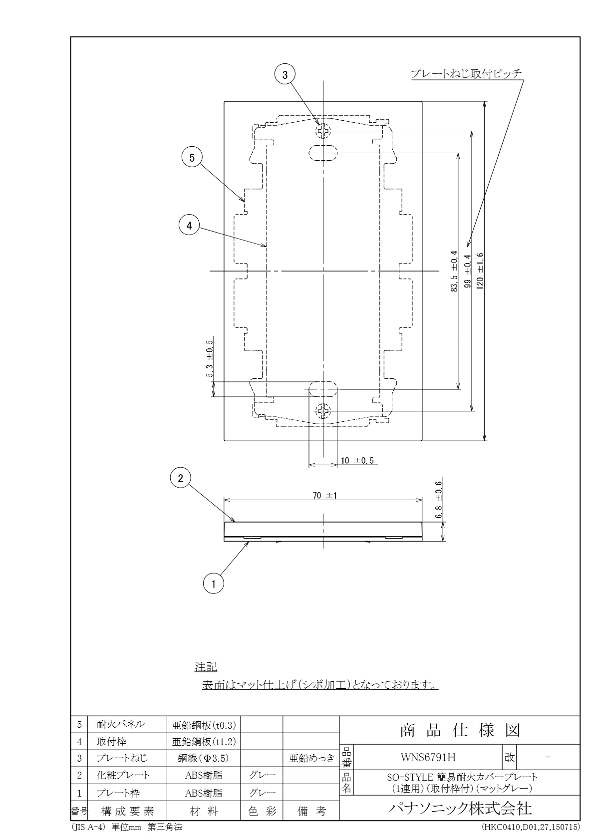 品番:WNS6791H品名:SO-STYLE簡易耐火カバープレート(1連用)(取付枠付)(マットグレー)