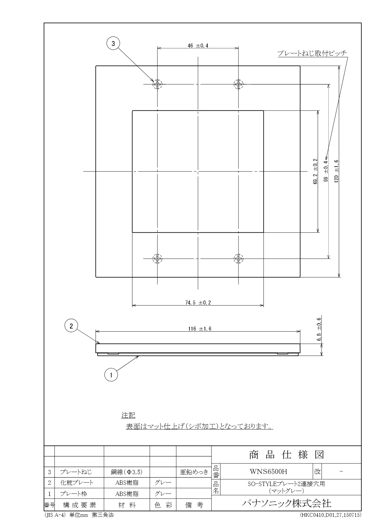品番:WNS6500H品名:SO-STYLEプレート2連接穴用(マットグレー)