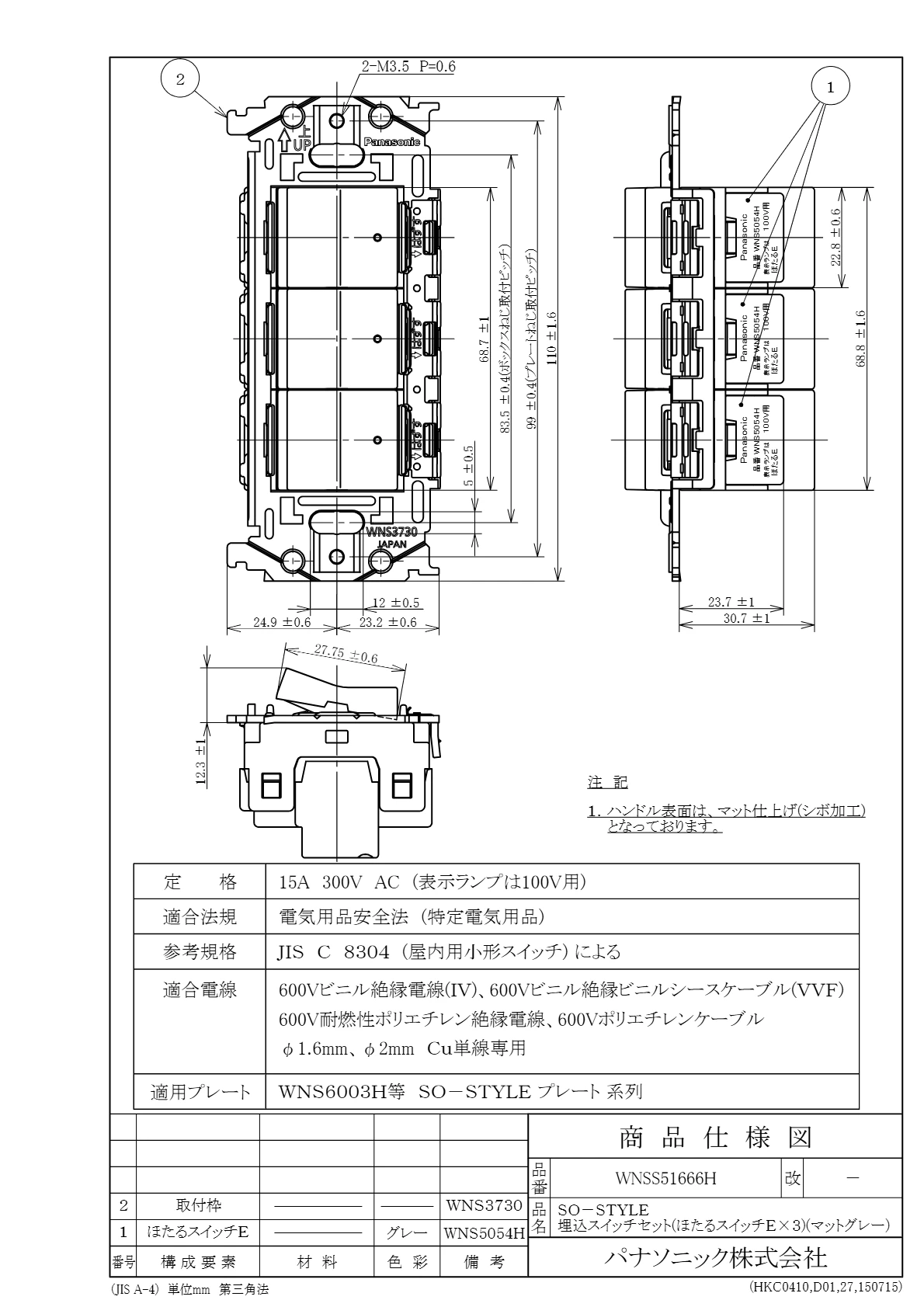 品番:WNSS51666H品名:SO-STYLE埋込スイッチセット(ほたるスイッチE×3)(マットホワイト)