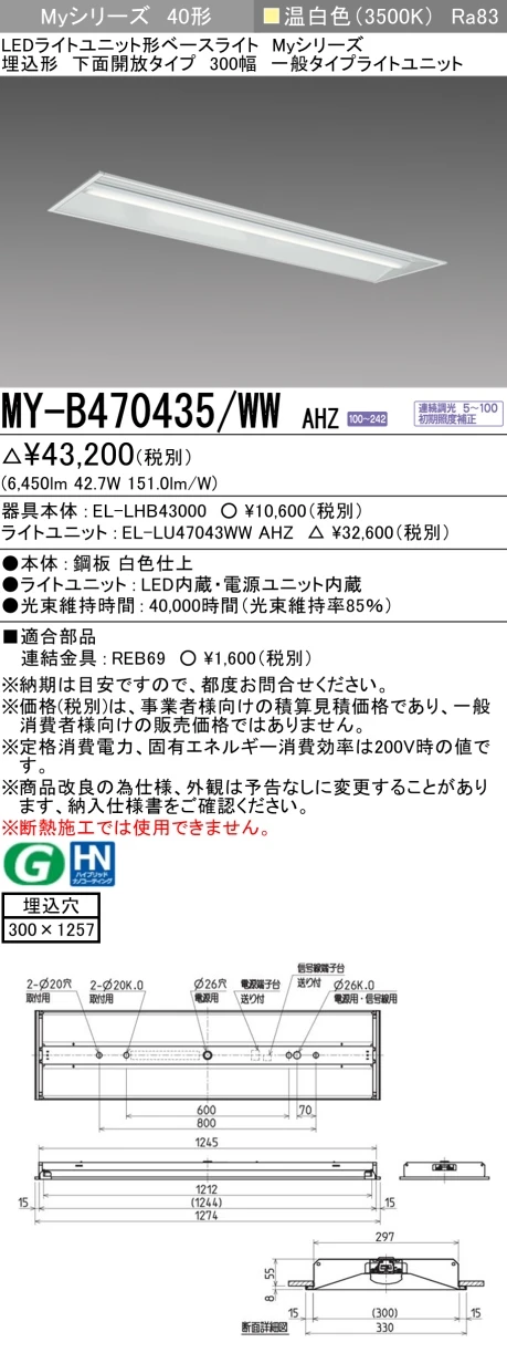 MY-B470435/WW AHZ 埋込形ベースライト 300幅 一般タイプ FHF32(高出力)x2相当 温白色 調光タイプ