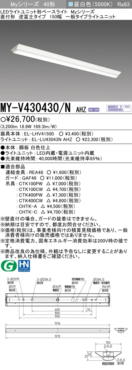 MY-V430430/N AHZ 逆富士形(V形)照明器具 150幅 一般タイプ FHF32(高出力)x1相当 昼白色 調光タイプ