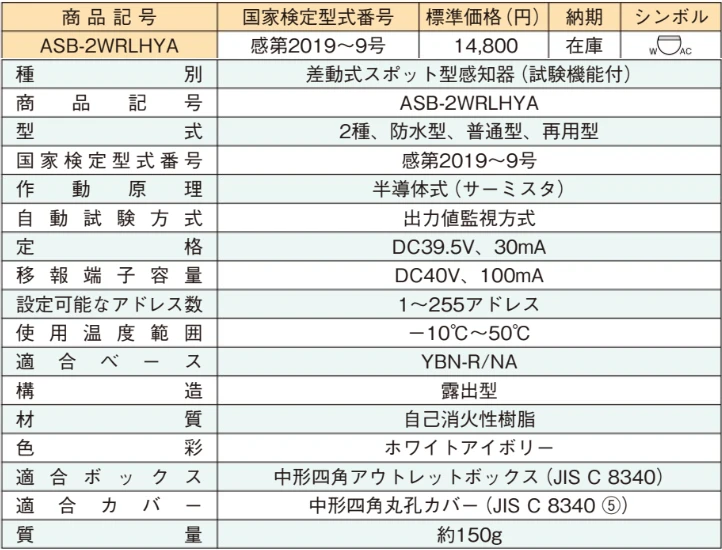 ASB-2WRLHYA 差動式スポット型感知器(露出型)(防水型)(自動試験機能付)(移報付)