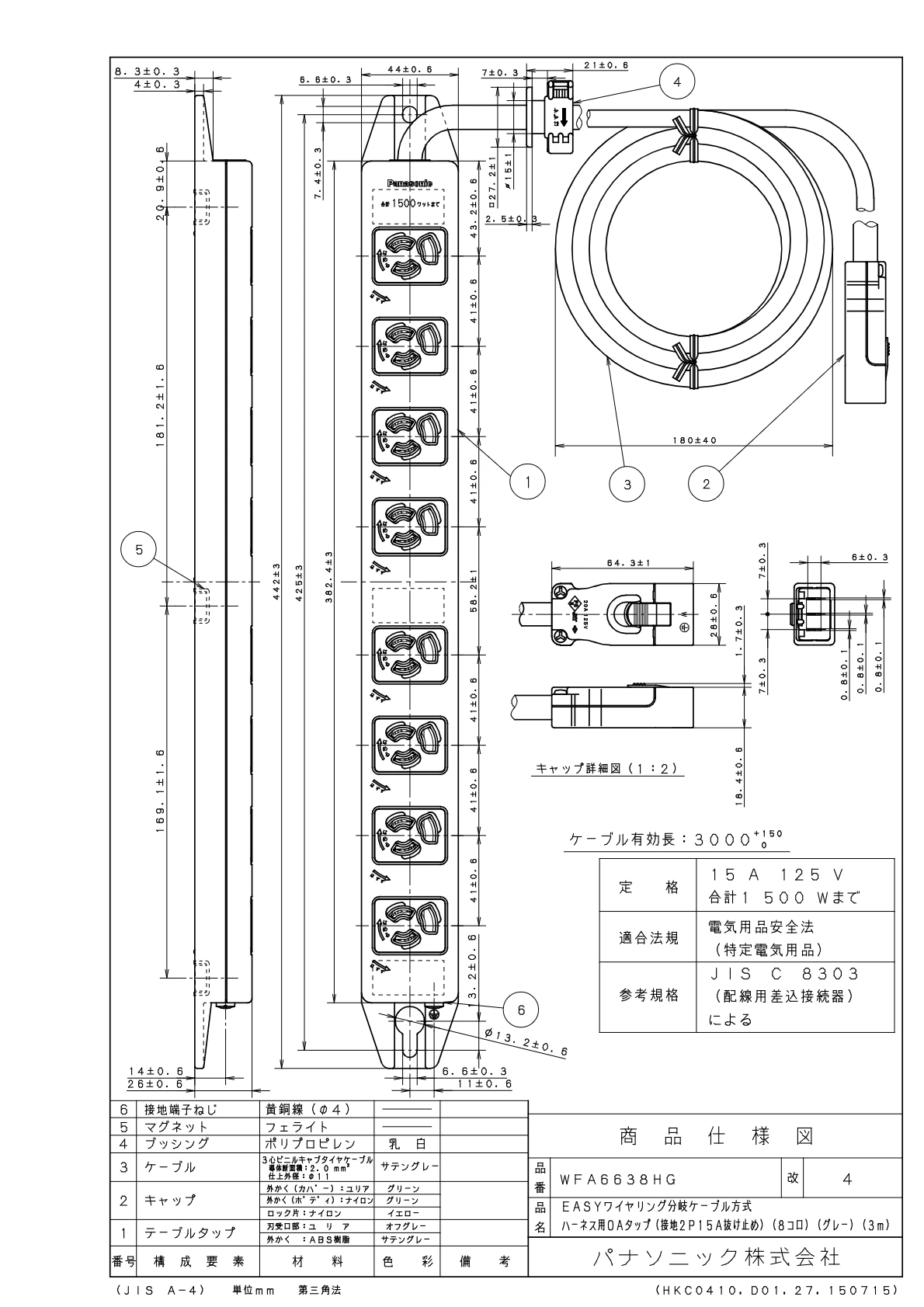 - 電設資材 > パナソニック(Panasonic) > タップ > ハーネス用OAタップ > 8コ口抜け止めアース付