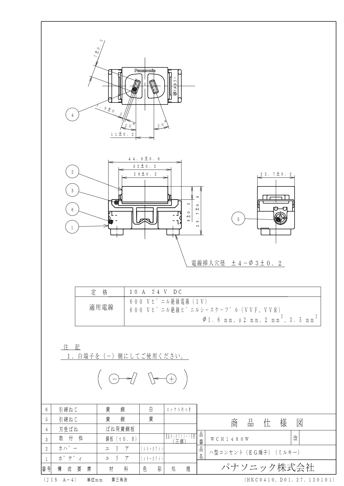 品番:WCH1480W品名:[機器用]DC用ハ型コンセント(EG端子)(ミルキー)