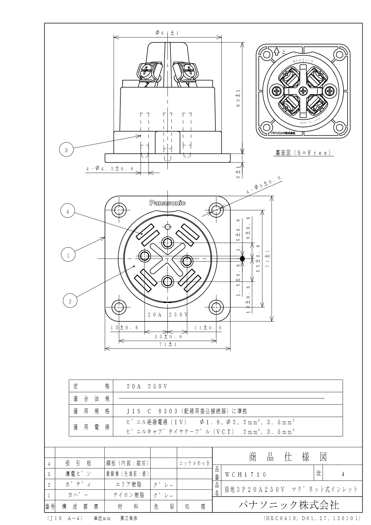 品番:WCH1710品名:接地3P20A250Vマグネット式インレット